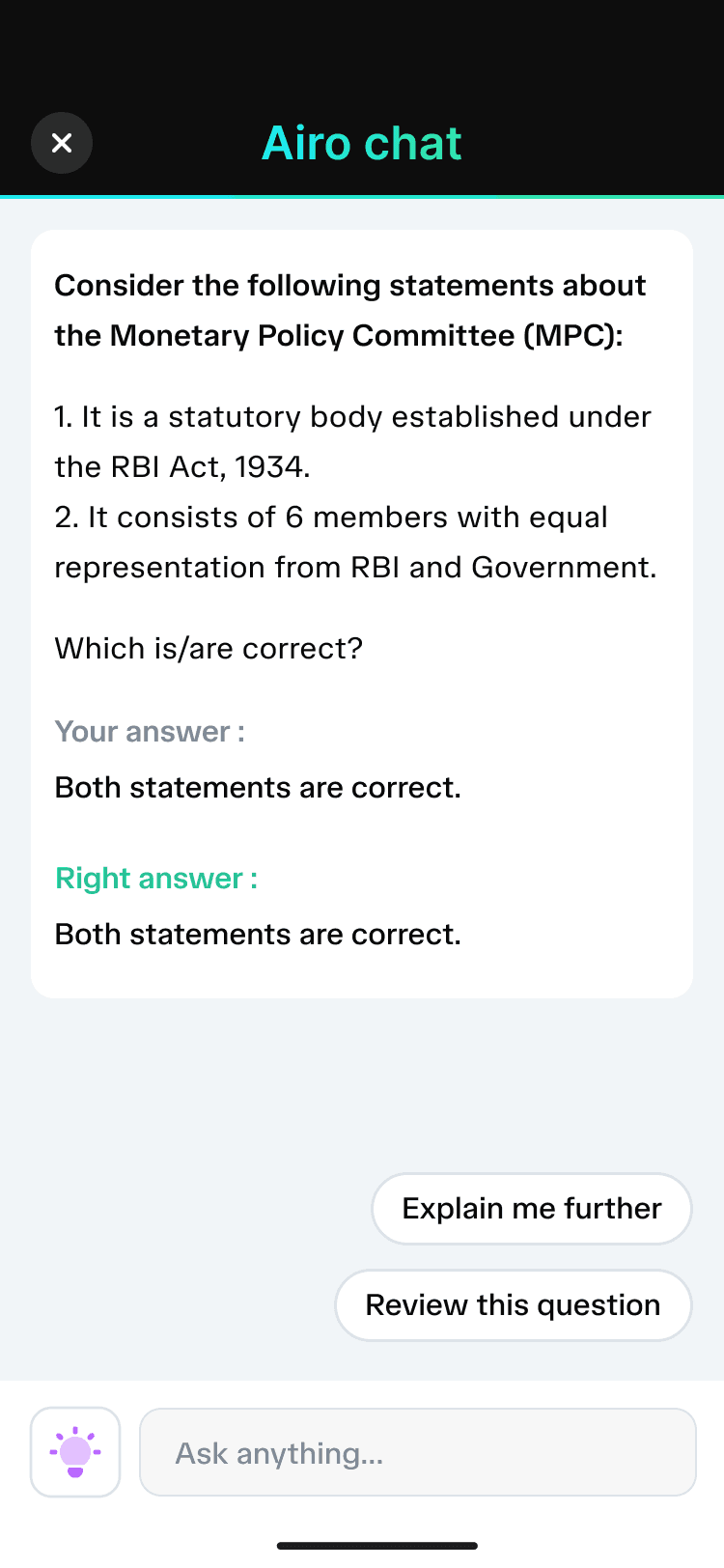 Just tap "Ask Airo" on any question and get instant explanations, follow ups, or similar practice questions. No waiting. No doubt backlog.